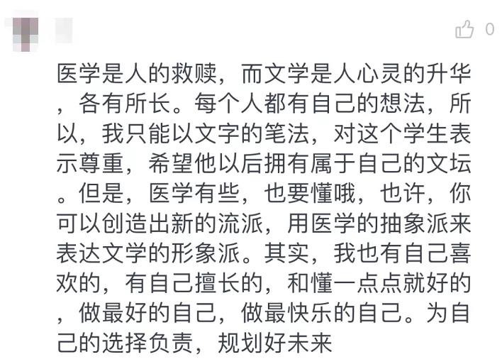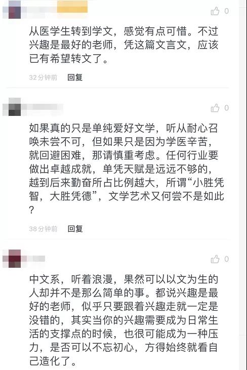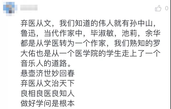 如今的大环境下,“实用主义”的专业更受欢迎。医老虎机 的学生要转中文系,其实是很让人感叹的。他把这封信拍照发到朋友圈,有了不少评论点赞:“这是要弃医从文啊!”