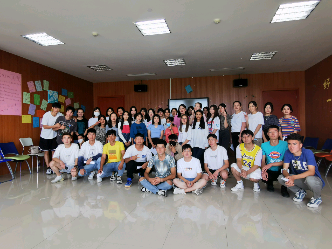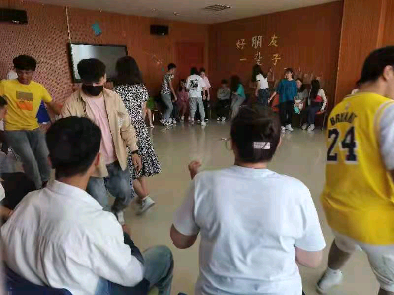 全班到齐后,活动正式开始,开场玩“大风吹”游戏,最开始听不懂游戏规则的同学们,经过学长带领玩两局后,渐渐熟悉了游戏规则;紧接着开启第二轮游戏——“解绳子”,同学们分成两组组成圈随意走动,听到口令跟左右两边的同学牵手并回复最初的模样;在欢笑声下开展了第三轮游戏——“一元五角”,同学们玩的十分尽兴,教室充满了欢笑声。活动结束之余,主持人以 “留言板”活动,让每位同学都收获了来自这个“友谊圈”的留言。随后应几位同学的要求,大家以热情高昂的新疆舞结束了活动。