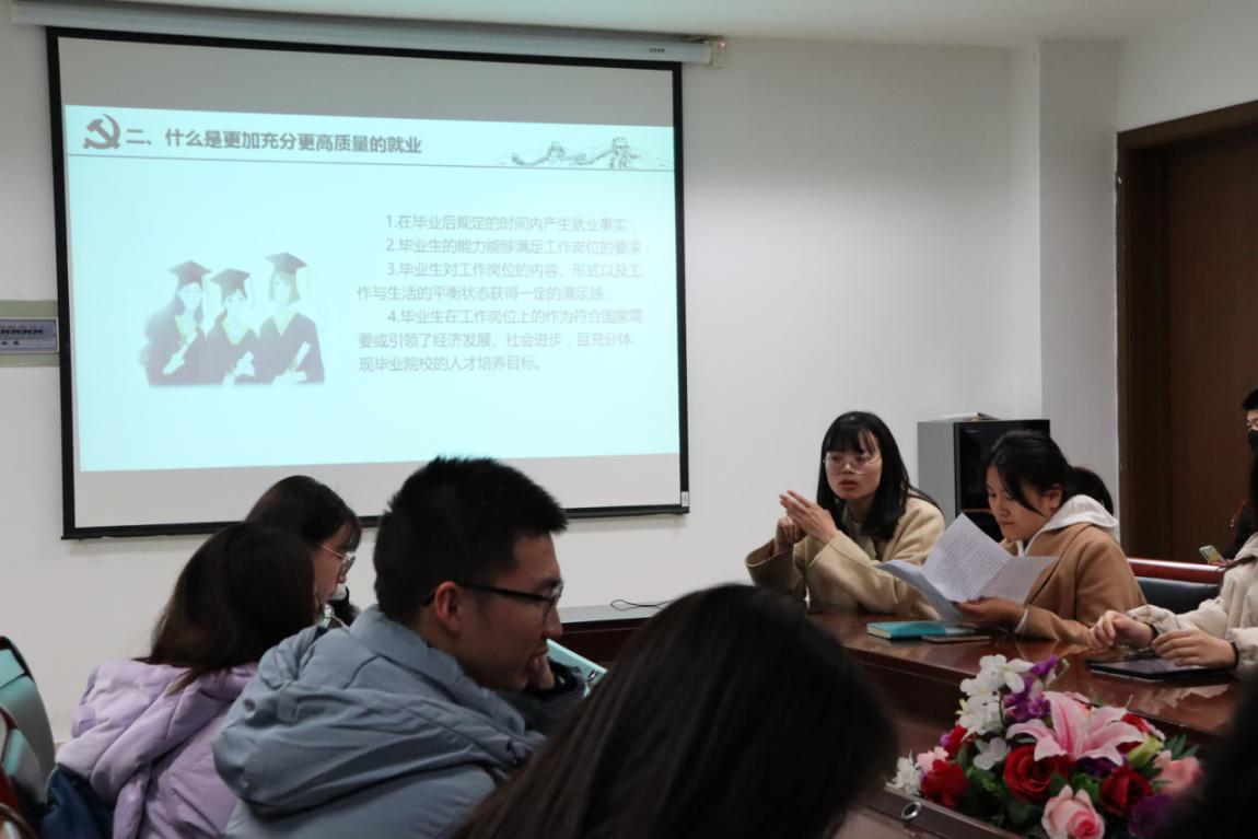 陈晓玲重点介绍了党在中国特色社会主义新时代的各方面的成就,聚焦于与在校生息息相关的社会建设中实现更充分、更高质量的就业,从国家、省和校的举措,来让同学们感受到为实现更充分、更高质量的就业的系列举措,来分析现阶段我国通过实现专业教育和就业创业教育的有效衔接真正达到了“更加充分、更高质量就业”的阶段目标。