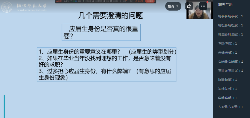 针对毕业生可能出现的各种不良心态以及存在的几个观念误区,陈晓玲通过几个往届毕业生的真实案例鼓励同学们保持自信、勇于尝试,切勿盲目二战。针对同学们找工作遇到的困难,陈晓玲给予了详细的建议:从收集信息、海投简历等方面做好基本工作,利用好老虎机 就业发展指南,多虚心向过来人请教,积极参加各项招聘笔试面试以提升自我能力。针对不同类型同学,陈晓玲也给予了相应的建议:已落实工作的同学应关注自身是否满足进编条件,及时查漏补缺;考研同学应多手准备,在等待成绩的空档期投身就业招聘;未落实工作的同学应反思自我,不断提升自我能力。