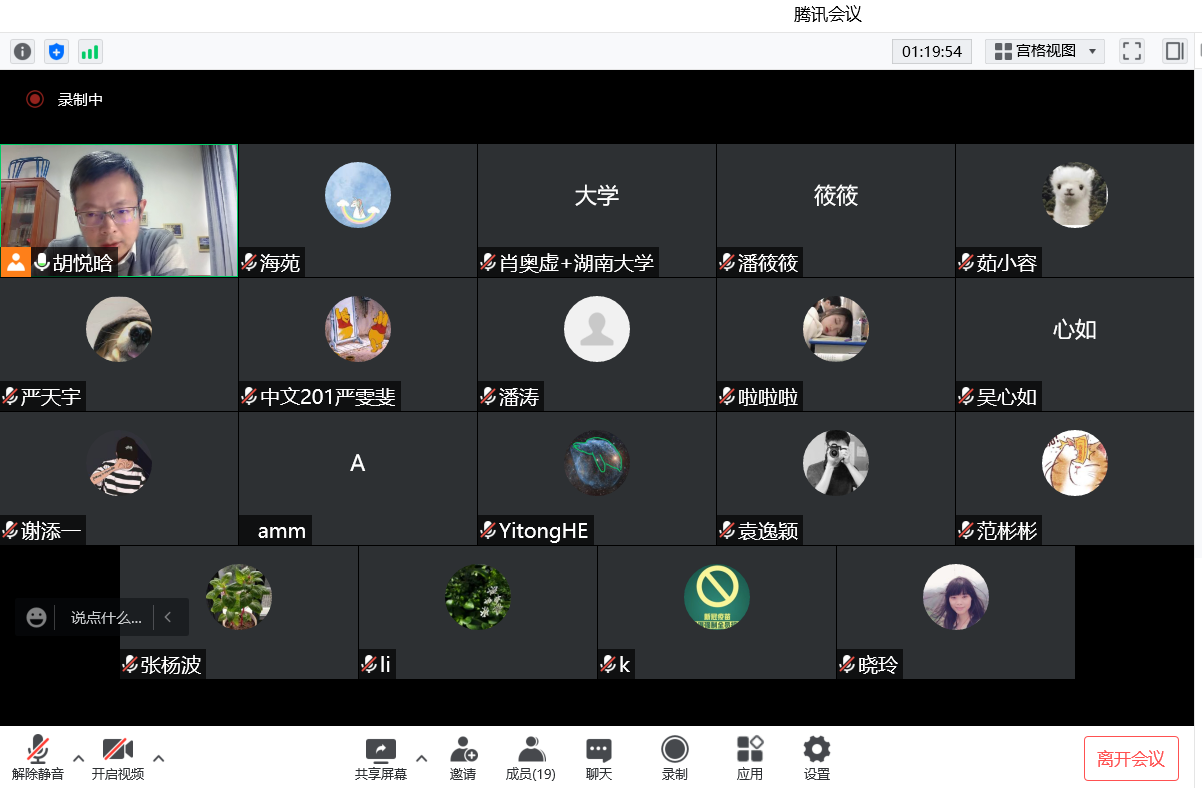 在胡老师简洁凝练的开场白后,老虎机 “递”听快递员“挑战杯”团队成员严天宇、茹小容、杨海苑、潘筱筱、严雯斐、范彬彬、谢添一、吴心如依次交流分享读书感悟并提出关于快递行业痛点、如何进行有效访谈等调研与阅读过程中产生的困惑。在华中师范大学中国近代史研究所读研的袁逸颖同学作为项目往届成员,也分享了自己的调研感受及对该书的阅读体会。