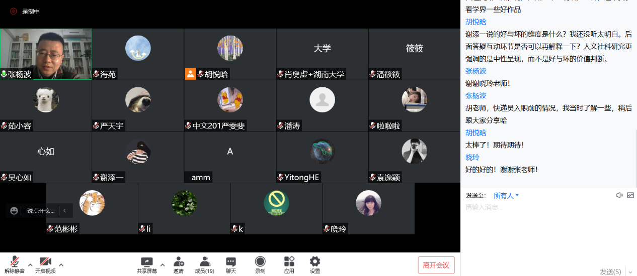 张杨波老师对同学们的阅读体会暨调研收获表示肯定,并从澄清过程、回应困惑与拓展预期三个层面分享了自己的经验与感悟。在澄清过程层面,张老师指出快递行业存在直营与加盟两个模式,不同快递公司、网点的差异化运营策略使得关于快递员研究的结论不尽相同,对不同模式的比较分析存在巨大的发掘潜力。在回应困惑层面,张老师认为快递员职业技能体系的形成是行业痛点之一,值得观察分析。针对快递员工作时间碎片化、建立熟人关系困难、程序化应答等特点,建议进行多次访谈,将访谈变成沟通闲聊,与受访者建立信任关系,根据配送业务差异、入职年限等不同维度区分快递员的类型。在拓展预期层面,张老师向团队提出三大建议:一、在资料分析和内容研究时不能太“端着”;二、采取整体的、多维的、的分析视角,三、关注快递员从“新手”变成“老司机”的职场转型与心路历程。胡悦晗老师补充指出,访谈者需要建立“持久战”的心理预期,应当注意区分快递员对生命历程的自我理解以及研究者对这一过程的理解两条线索;在国家权力与平台、算法日益紧密捆绑的转型过程中,凸显快递员作为个体的调适与挣扎。在最后的答疑互动环节,张杨波老师就快递驿站等有待深入观察的案例问题发表看法,鼓励团队成员对快递员群体展开更加细致、深入的调研发掘。
