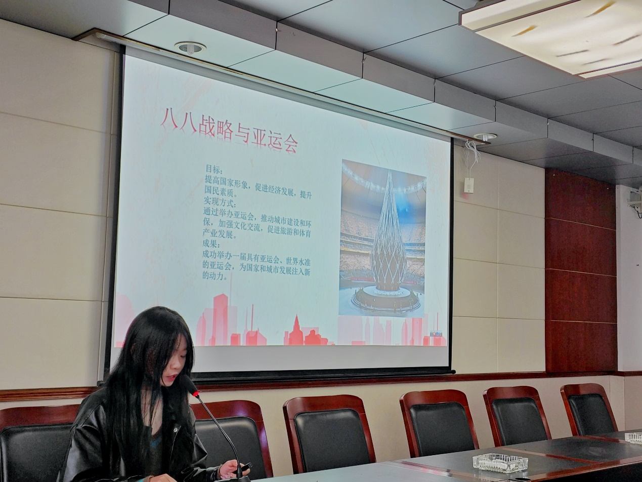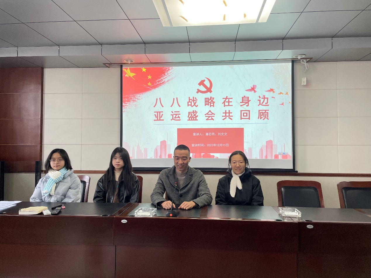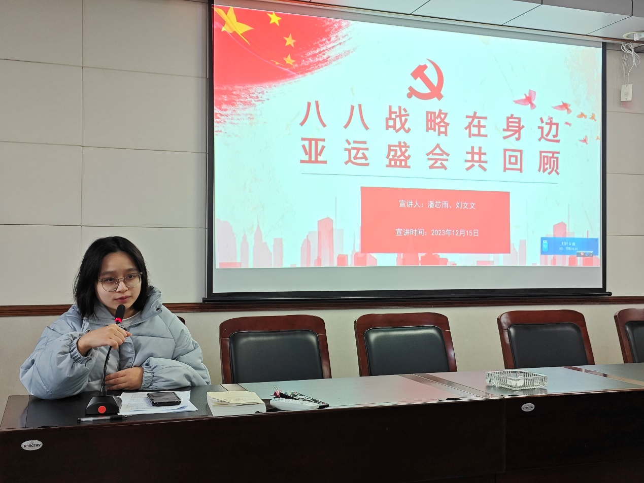 本次宣讲主要分为三个部分:“八八战略”的内容、“八八战略”的科学内涵以及“八八战略”的生动实践——回顾亚运盛会。宣讲者潘芯雨由八大优势、八个举措引入,深刻剖析了“八八战略”的科学内涵;并由一段亚运期间外国记者参观"大道之行——'八八战略'实施20周年"大型主题展览的视频实现时空跨越、同频共振,在场听众频频点头,无不沉浸于身为浙江人、身为杭州一分子的自豪之中。从义乌发车的中欧班列到“一带一路”,从“绿水青山就是金山银山”到亚运场馆“大莲花”高科技节水循环系统的运用,从全民运动的初衷到亚运村中国人的文化自信,开放、绿色、人文之风早已渗透于浙江人的点滴日常之中。宣讲者陈文文由亚运场馆的建设故事讲起,用生动案例阐释“八八战略”指引下浙江取得的卓越发展。一张张照片呈现出杭州近年来的蝶变之路,亚运精神同“八八战略”汇于一道,共同书写"心心相融,爱达未来"的中国故事。