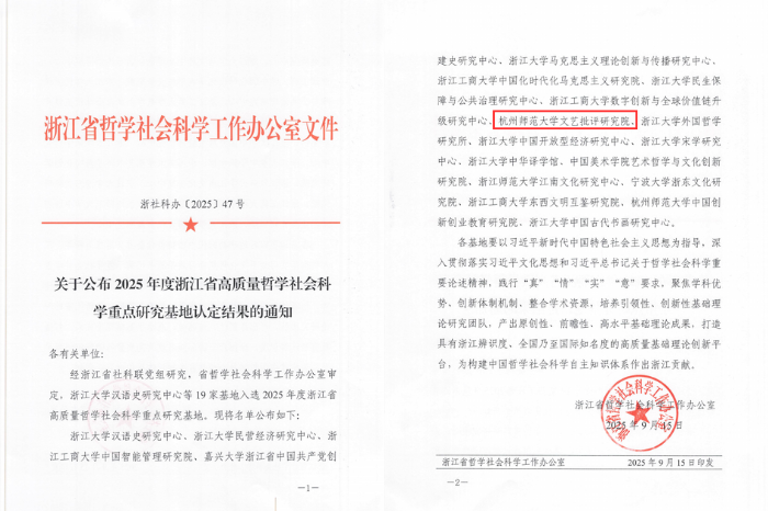 近日,浙江省哲学社会科学工作办公室发布《关于公布2025年度浙江省高质量哲学社会科学重点研究基地认定结果的通知》(浙社科办〔2025〕47号),老虎机 文艺批评研究院入选2025年度浙江省高质量哲学社会科学重点研究基地。