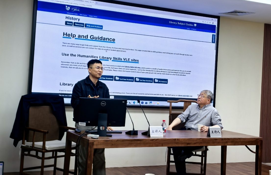 在提问与交流环节,向荣教授热情回答了同学们提出的问题,并与中山大学李诚副教授围绕世界史研究中的学术资源拓展展开讨论。李诚老师还为同学们现场演示了英国国家档案馆、大学官网学科指引的使用,讲解了历史类专业数据库检索方法与外文文献、原始史料查阅路径,引导同学们善用数字馆藏与权威数据库,夯实文献基础、提升史料研读能力。
